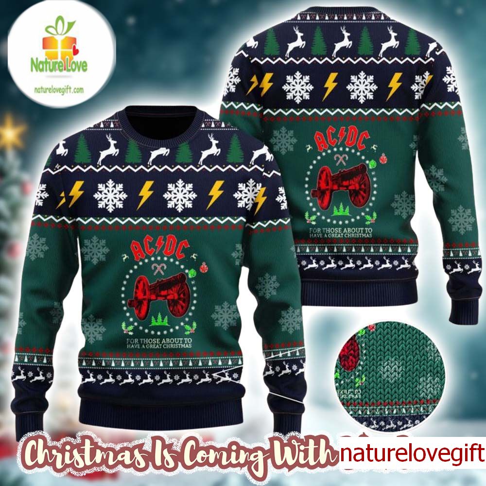 ACDC For Those To Have A Great Christmas Xmas Wreath Cannon Knitted Green Christmas Ugly Sweater