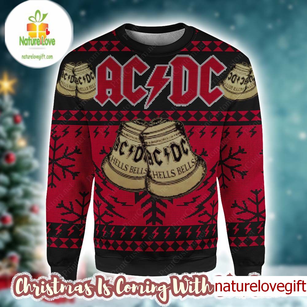 ACDC Hells Bells Signature Bells Snowflakes Pattern Black And Red Vintage Ugly Christmas Sweater