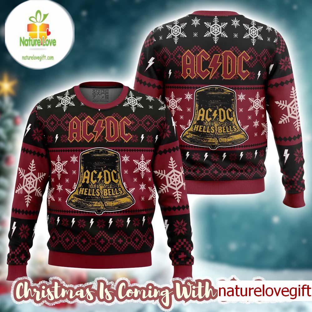 ACDC Hells Bells Signature Big Cracked Bell With Snowflakes Pattern 2025 Christmas Ugly Sweater