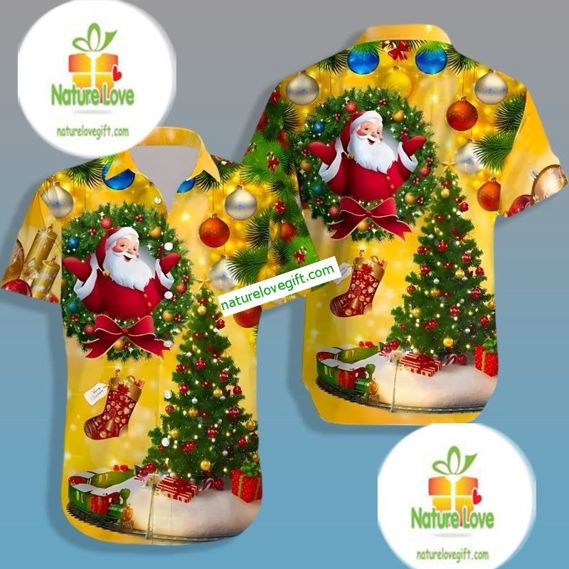 Order your Christmas Wreath Bell Santa Claus Xmas Tree Yellow Hawaiian Shirt Print at Nature Love Gift! β€οΈ