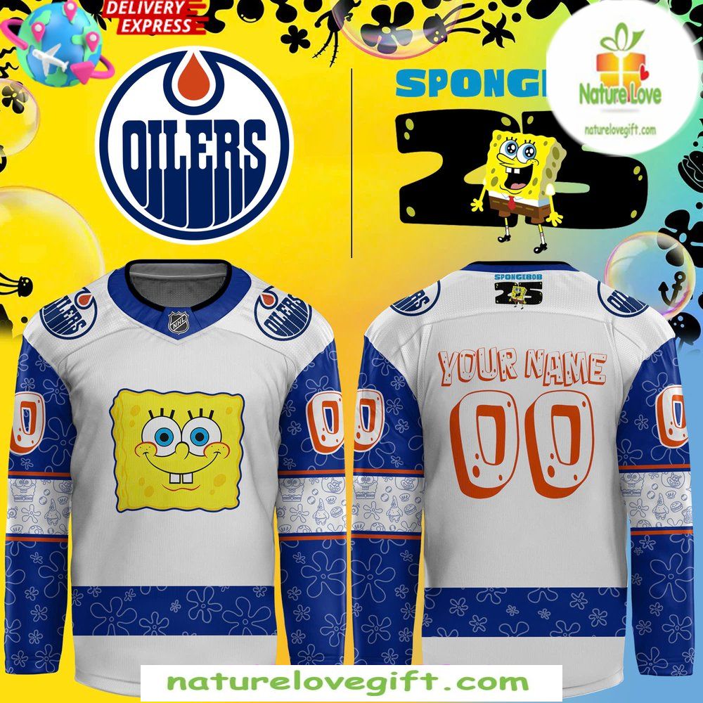 Order your Edmonton Oilers Spongebob Hockey Jersey 25th Anniversary Custom at Nature Love Gift! ❤️