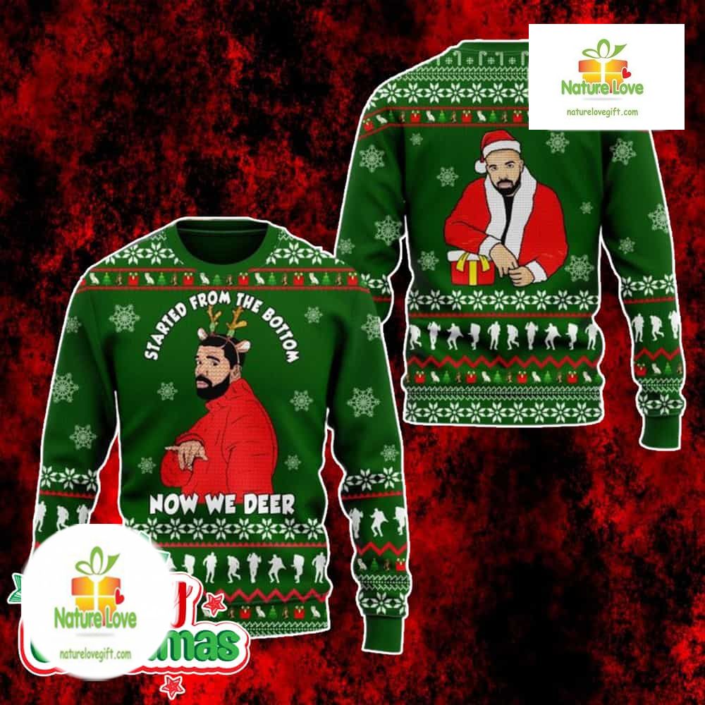 Funny Christmas Sweater Drake Started From Bottom Green Reindeer Holiday Jumper