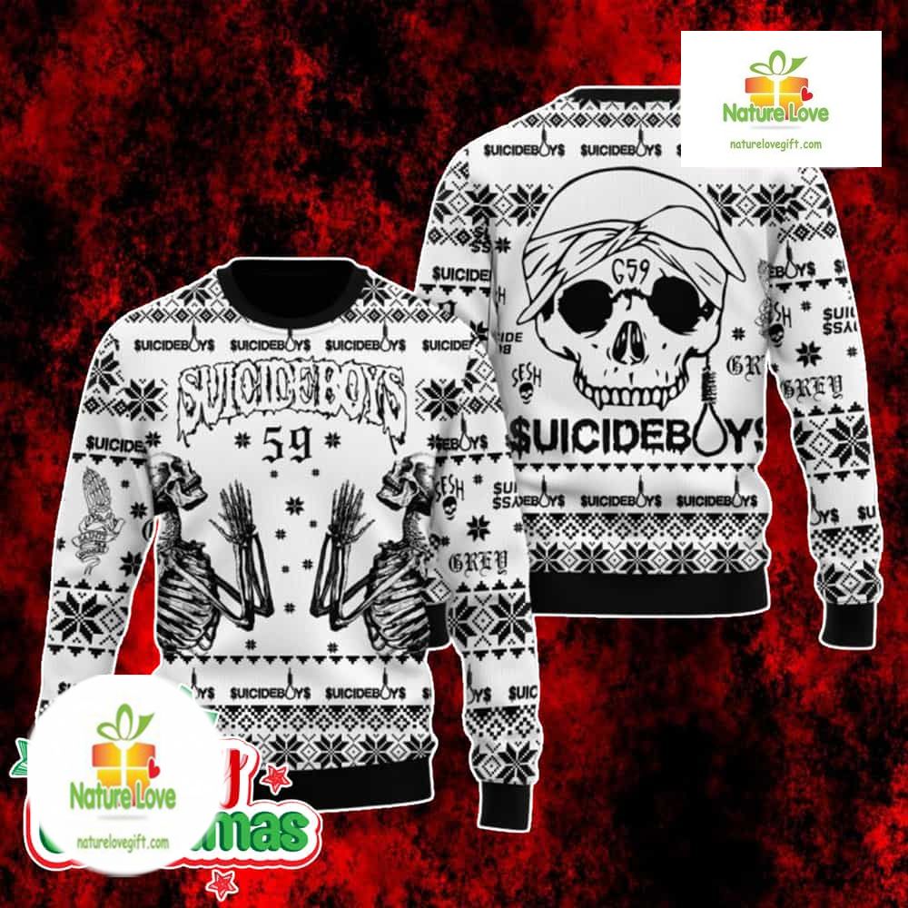 Inject a dose of edgy humor into your holiday celebrations with the G59 Ugly Christmas Sweater, featuring a striking Suicideboys Skeleton Skull design in a cool grey hue. This isn't just your average festive attire; it's a bold statement piece that captures the essence of alternative culture while keeping you cozy during those chilly winter nights.Imagine strolling through a holiday party, turning heads and sparking conversations as you showcase this unique blend of nerd humor and seasonal spirit. Perfect for those who revel in non-traditional holiday fashion, this sweater is ideal for game nights, family gatherings, or just lounging at home with friends.Crafted for comfort and style, it’s a must-have for anyone looking to stand out this season. Don’t let your wardrobe be as predictable as the usual Christmas tunes—grab your G59 Ugly Christmas Sweater today and let your personality shine through!