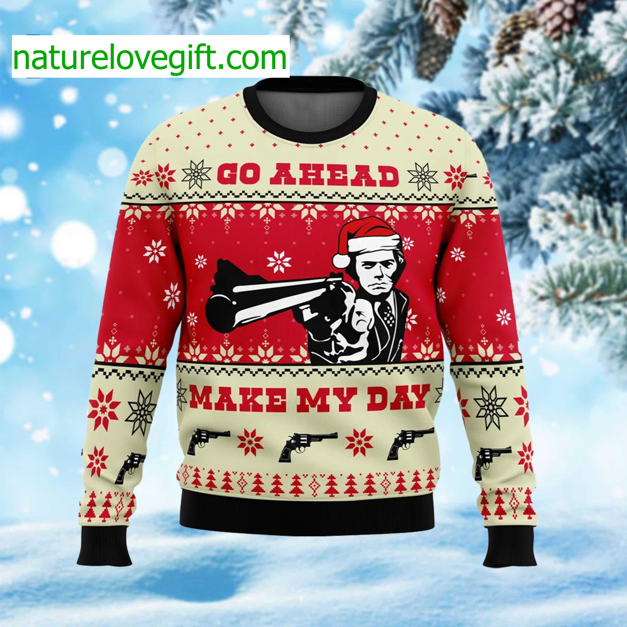 Get ready to embrace the holiday spirit with our Go Ahead Make My Day Ugly Christmas Sweater! This festive creation is not just a garment; it’s a bold statement piece that captures the essence of holiday cheer and nerdy humor. Featuring an eye-catching design adorned with playful graphics and vibrant colors, this sweater is perfect for those who love to stand out at any Christmas gathering or ugly sweater party.Crafted for comfort and style, it’s made from soft, breathable fabric that keeps you cozy while you sip hot cocoa and share laughs with friends. Imagine yourself wrapped in warmth, exchanging gifts, or posing for hilarious family photos, all while showcasing your unique personality.Whether you’re planning a night of festive fun or simply want to bring some joy to your everyday wear, this sweater is your go-to choice. Don’t miss out on the chance to spread smiles and laughter this season—grab yours today and make your holiday memorable!