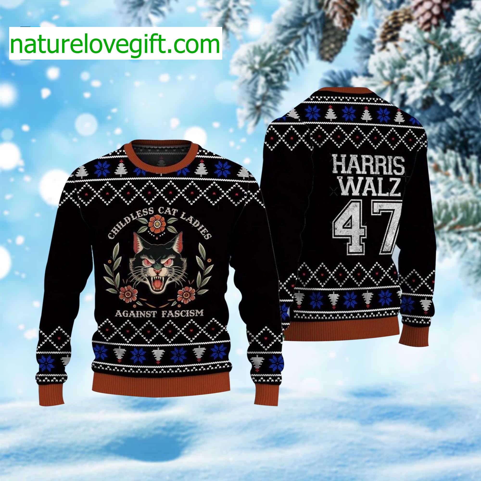 Harris Walz 47 Childless Cat Ladies Against Ugly Christmas Sweater details: