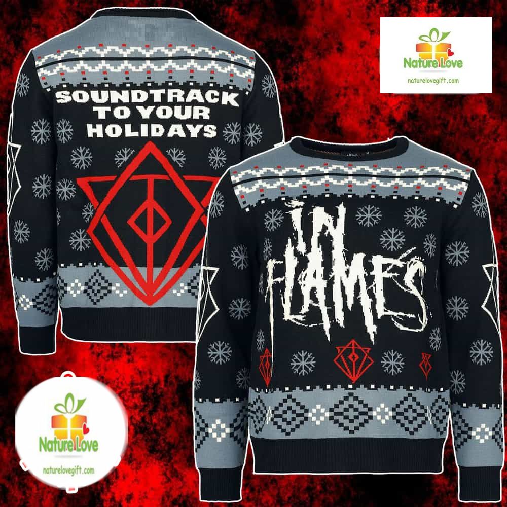 In Flames Ugly Christmas Sweater Black Red Snowflake Band Merch Holiday details: