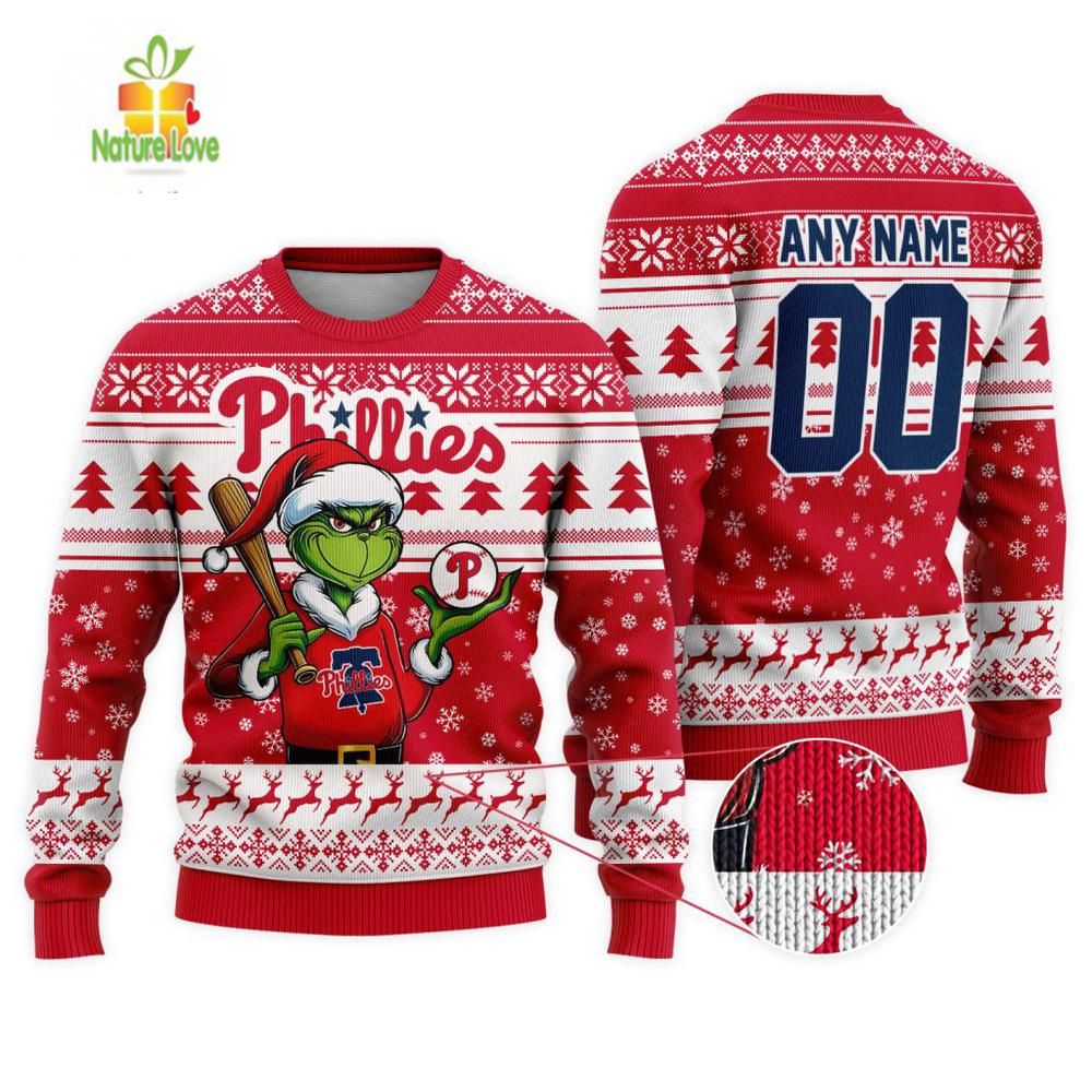 MLB Philadelphia Phillies Grinch Christmas Ugly Sweater details: