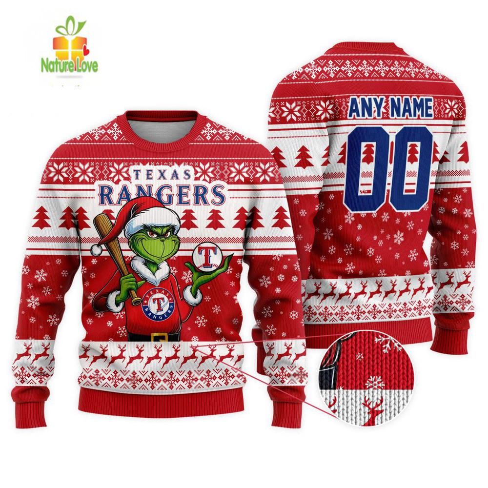 Decked out in festive flair, the MLB Texas Rangers Grinch Christmas Ugly Sweater merges holiday cheer with team spirit. Imagine gathering with friends and family, your favorite holiday tunes playing, while you proudly sport this whimsical design that captures the essence of the season with a playful nod to the beloved Grinch.Crafted for those who embrace cozy nights and spirited gatherings, this sweater is perfect for game day festivities or holiday parties. The vibrant colors and cheeky graphics will not only keep you warm but also spark conversations among fellow fans and holiday lovers alike.Whether you’re decorating the tree or cheering on the Rangers, this unique piece guarantees you’ll stand out. Celebrate the season in style and show your team pride with a touch of humor. Don’t miss out—grab your Grinch sweater today and make this holiday unforgettable!
