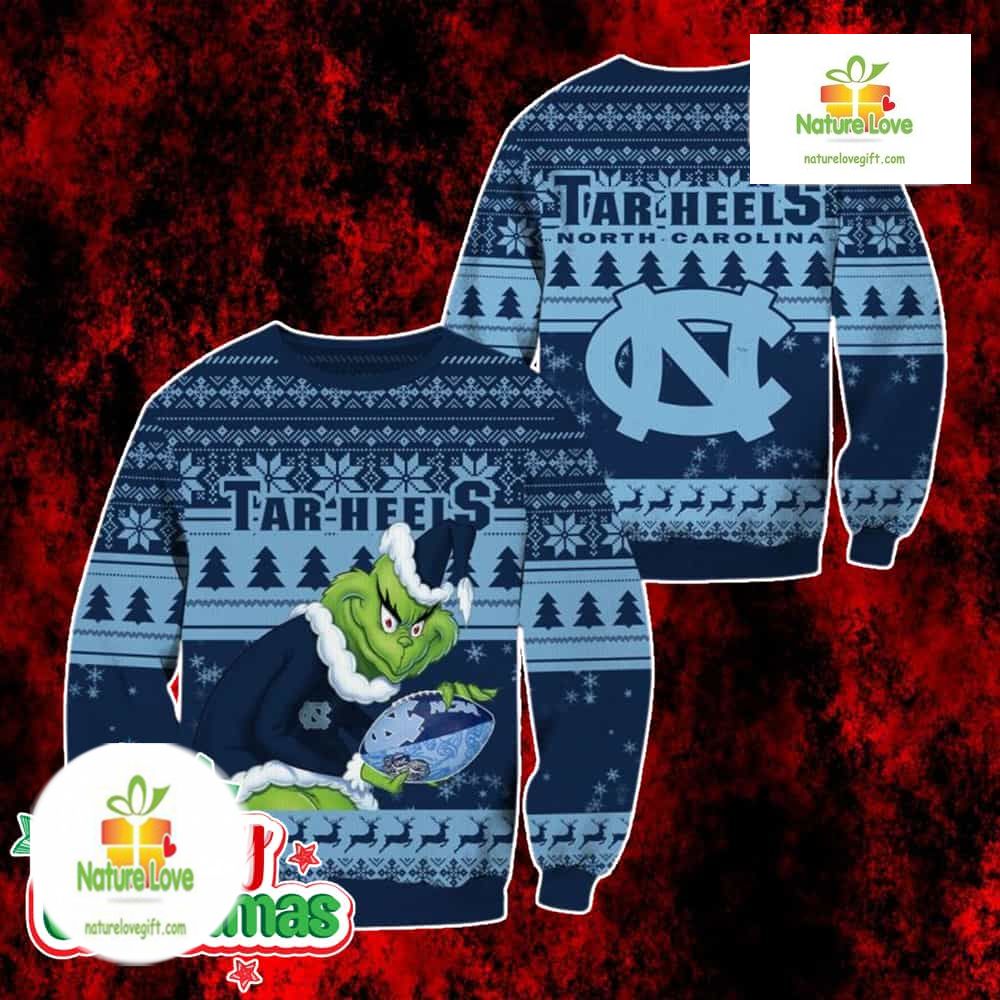 NCAA Tar Heels Grinch Ugly Christmas Sweater Light Blue Navy Pullover