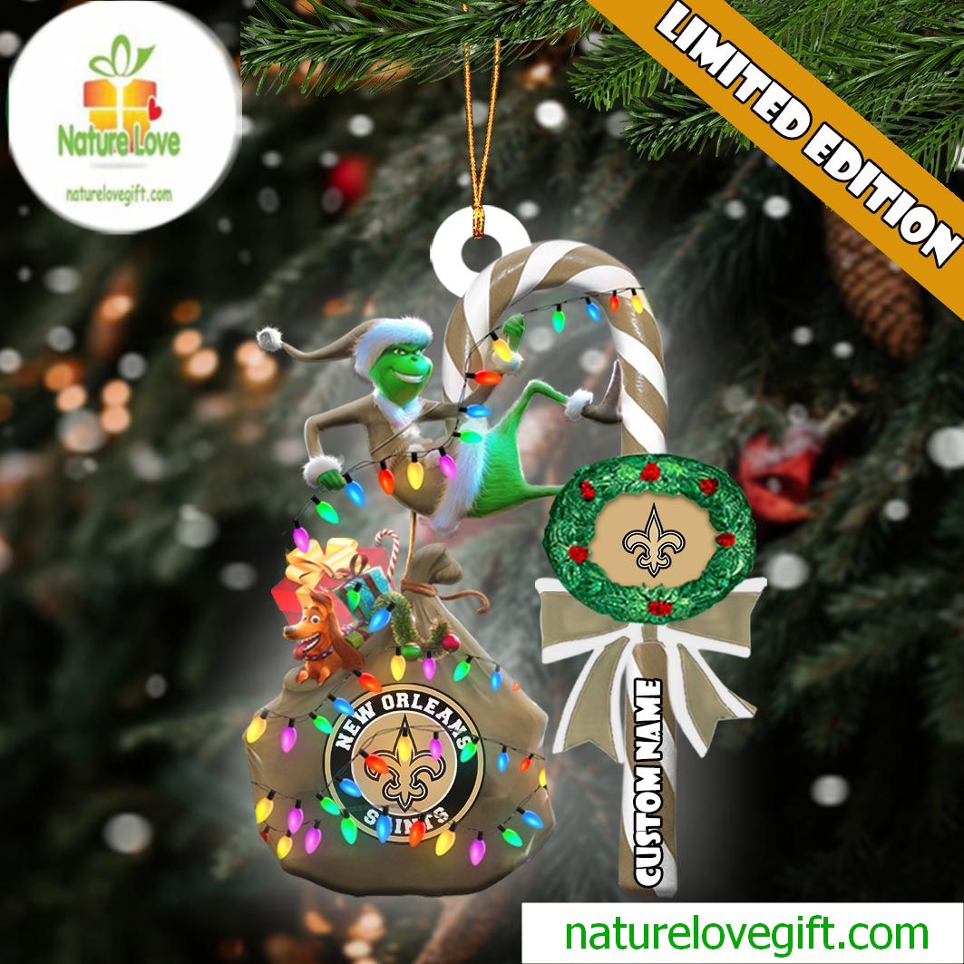 Order your New Orleans Saints NFL Custom Grinch Candy Cane Name Ornament 2025 Xmas Tree Gift at Nature Love Gift! ❤️