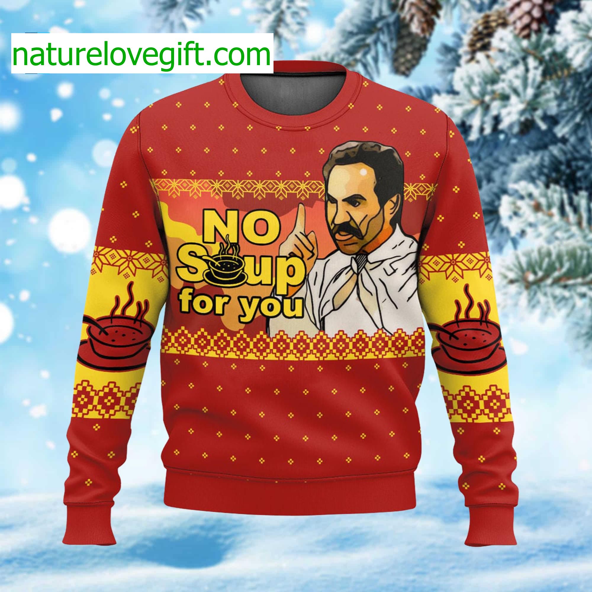 Wrap yourself in a cozy blend of nostalgia and humor with our No Soup For You Seinfeld Christmas Sweater. This delightful piece captures the essence of one of television's most iconic moments, making it a perfect gift for fans who appreciate a touch of nerd humor during the holiday season. The sweater's vibrant design features a playful nod to the infamous soup line, ensuring you’ll stand out at any festive gathering or casual winter outing.Crafted for comfort and style, this sweater is ideal for holiday parties, cozy nights in, or simply showcasing your love for classic sitcoms. Pair it with your favorite jeans or festive pajama pants for a laid-back, yet fun look.Don’t let the season pass without adding a sprinkle of laughter to your wardrobe. Celebrate your fandom and spread cheer with this unique piece—perfect for gifting or treating yourself!