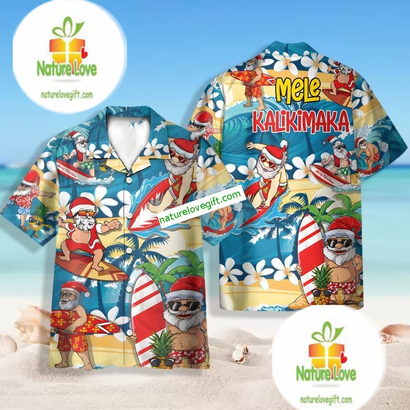 Order your Santa Surfing Mele Kalikimaka Christmas In July Blue Hawaiian Camp Shirt at Nature Love Gift! ❤️