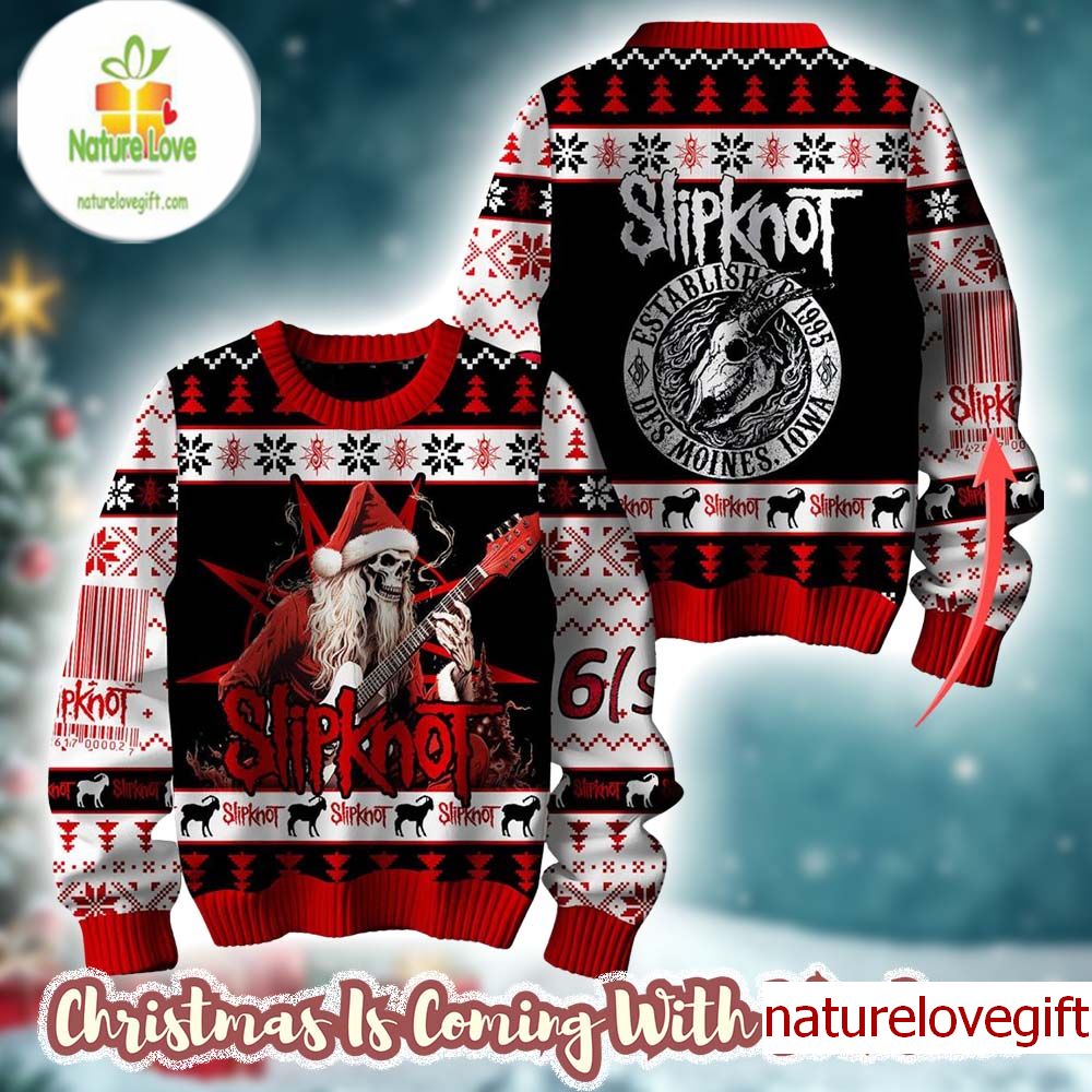Slipknot Established 1995 Des Moines Iowa Skeleton Santa Playing Guitar Personalized Christmas Ugly Sweater